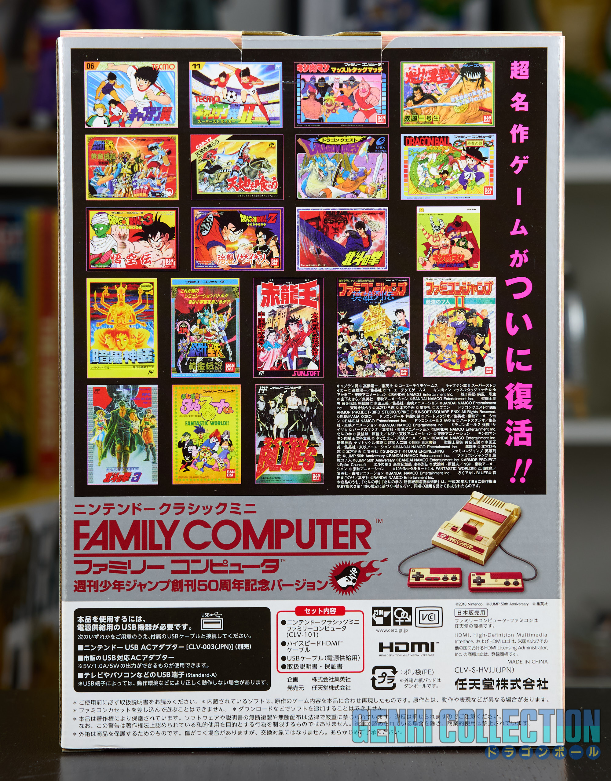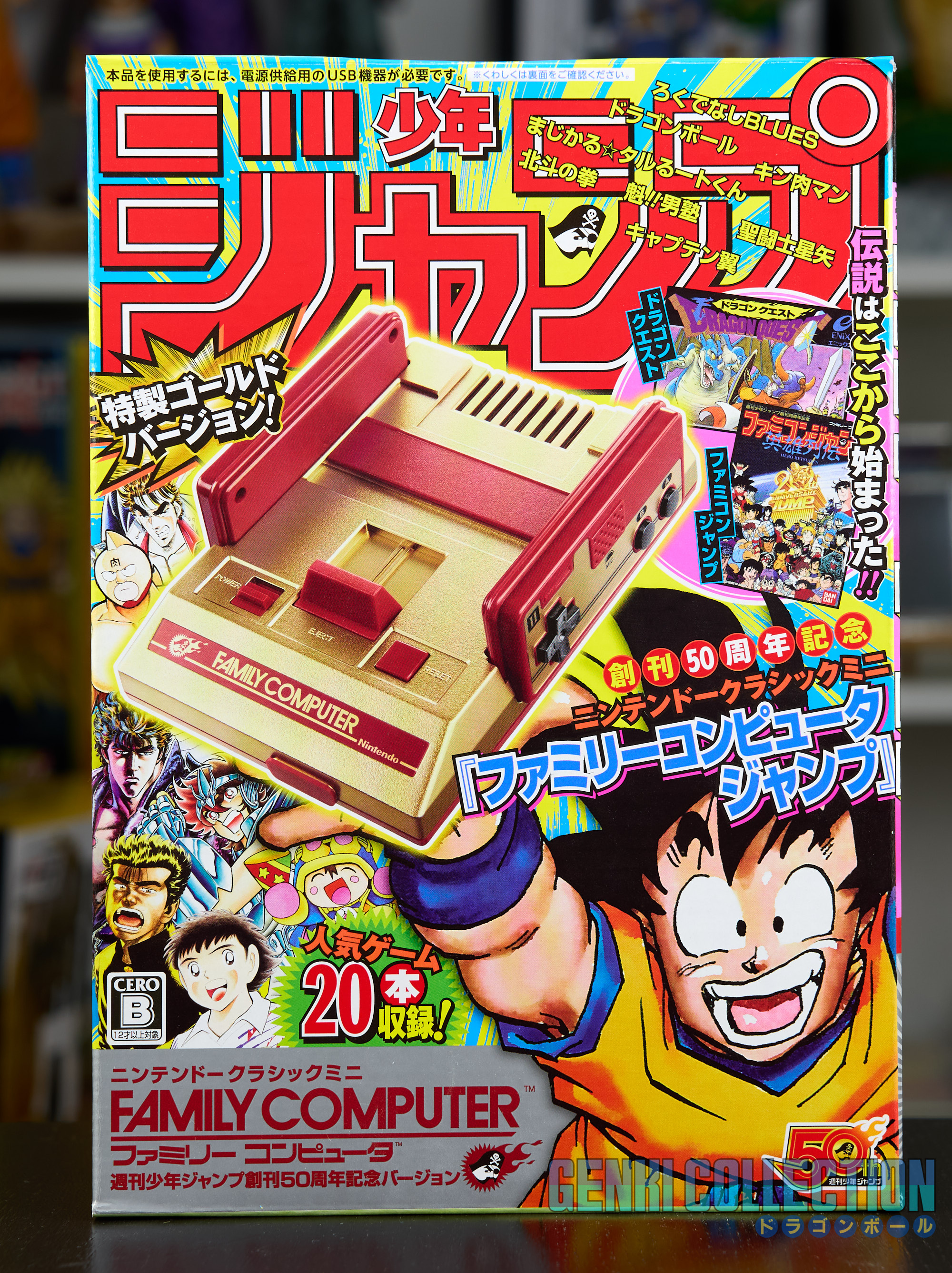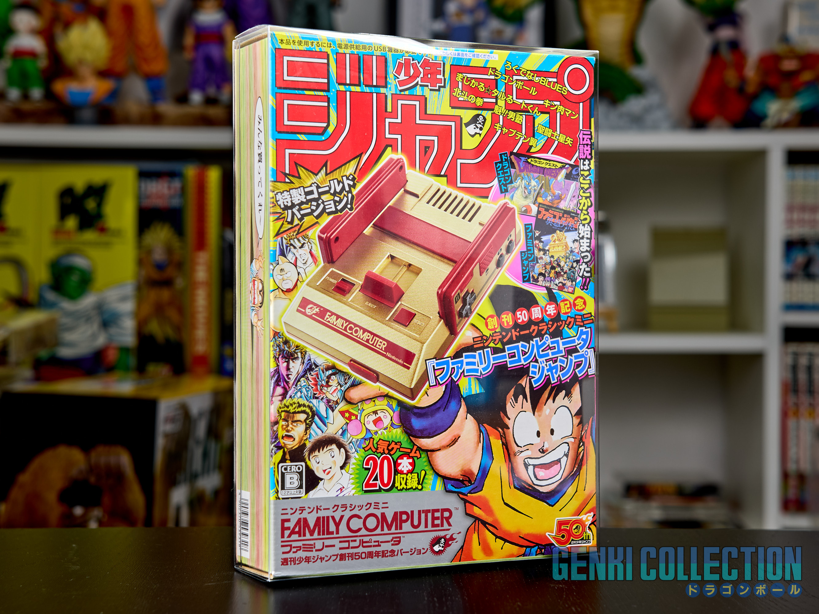 Famicom Jump Mini console presented in its Crystal Box, specially created to commemorate the 50th anniversary of Weekly Shonen Jump magazine in 2018. The console in its golden finish is complete and in mint condition, used only for making a YouTube video. The protective outer cardboard box is also included.
