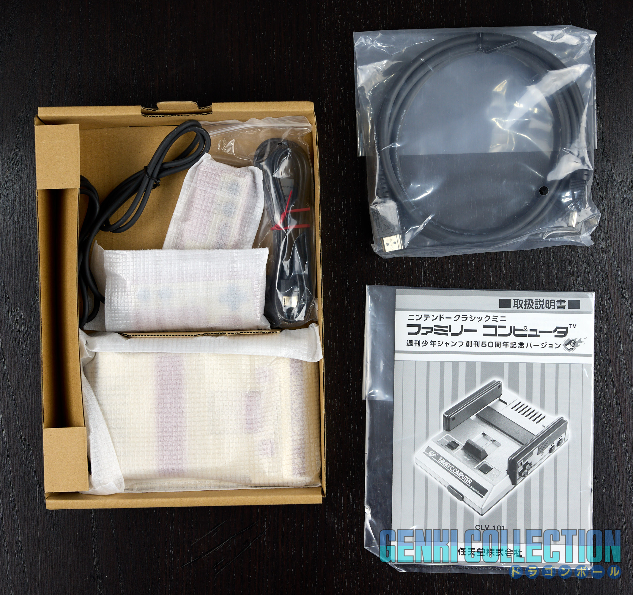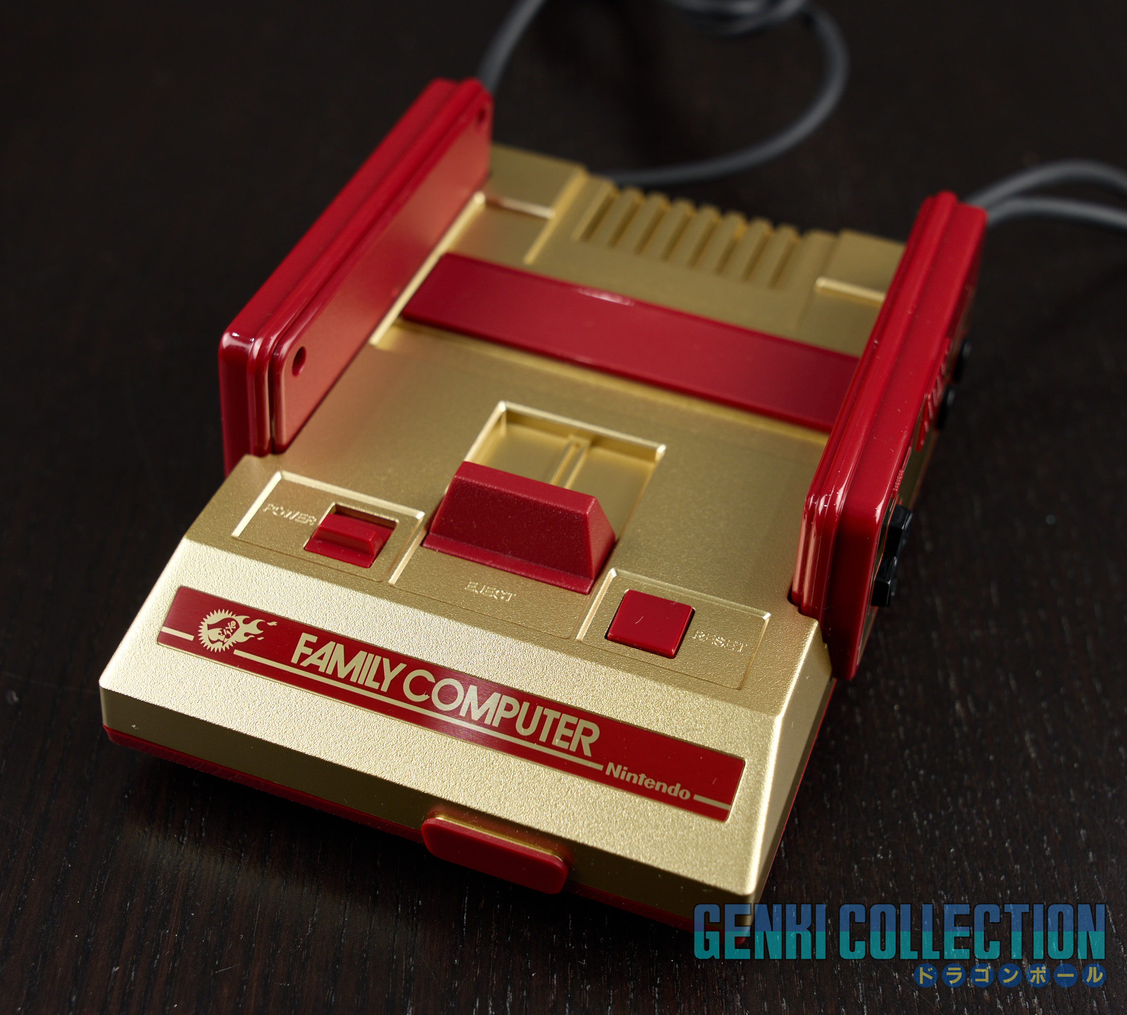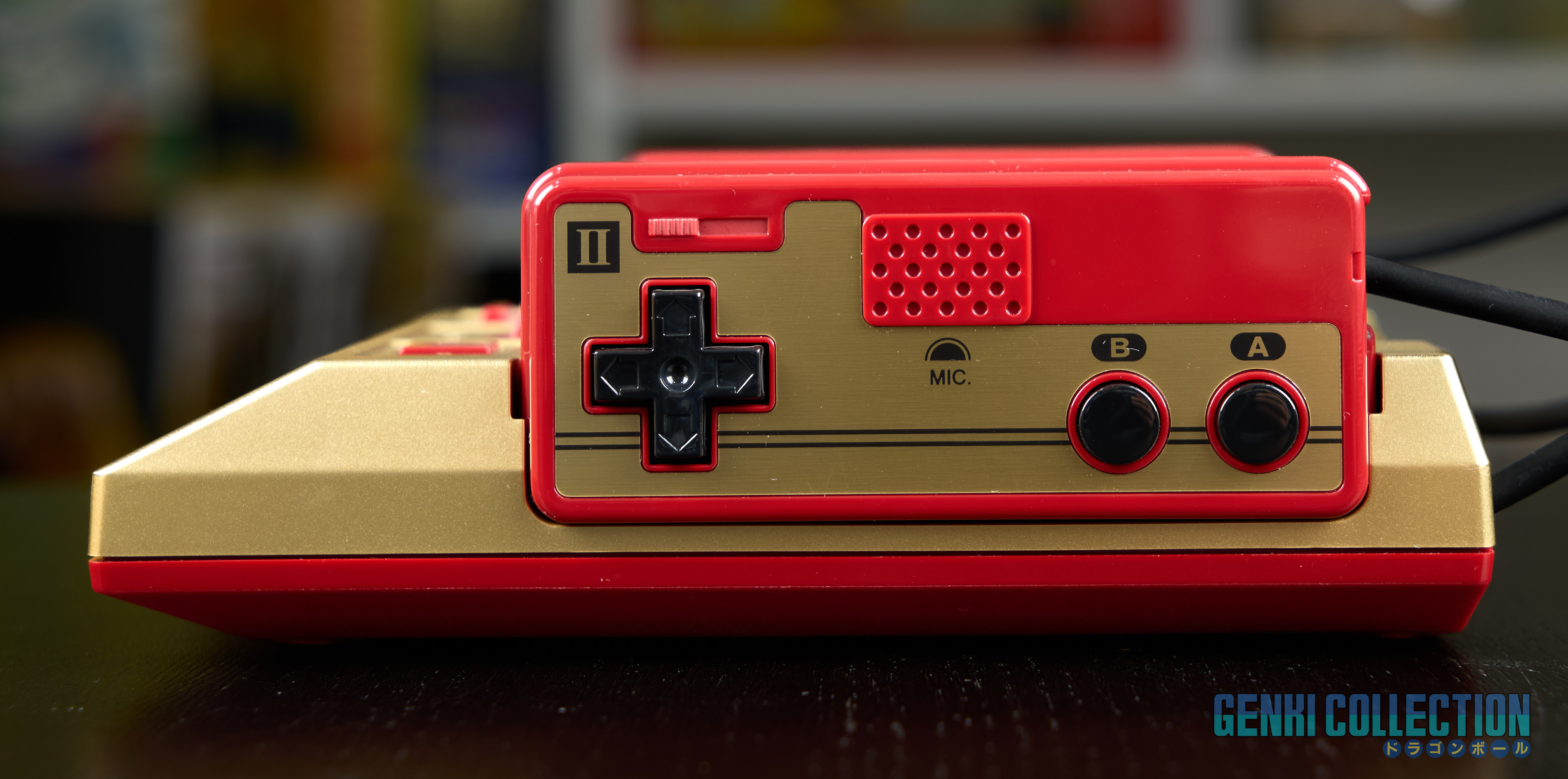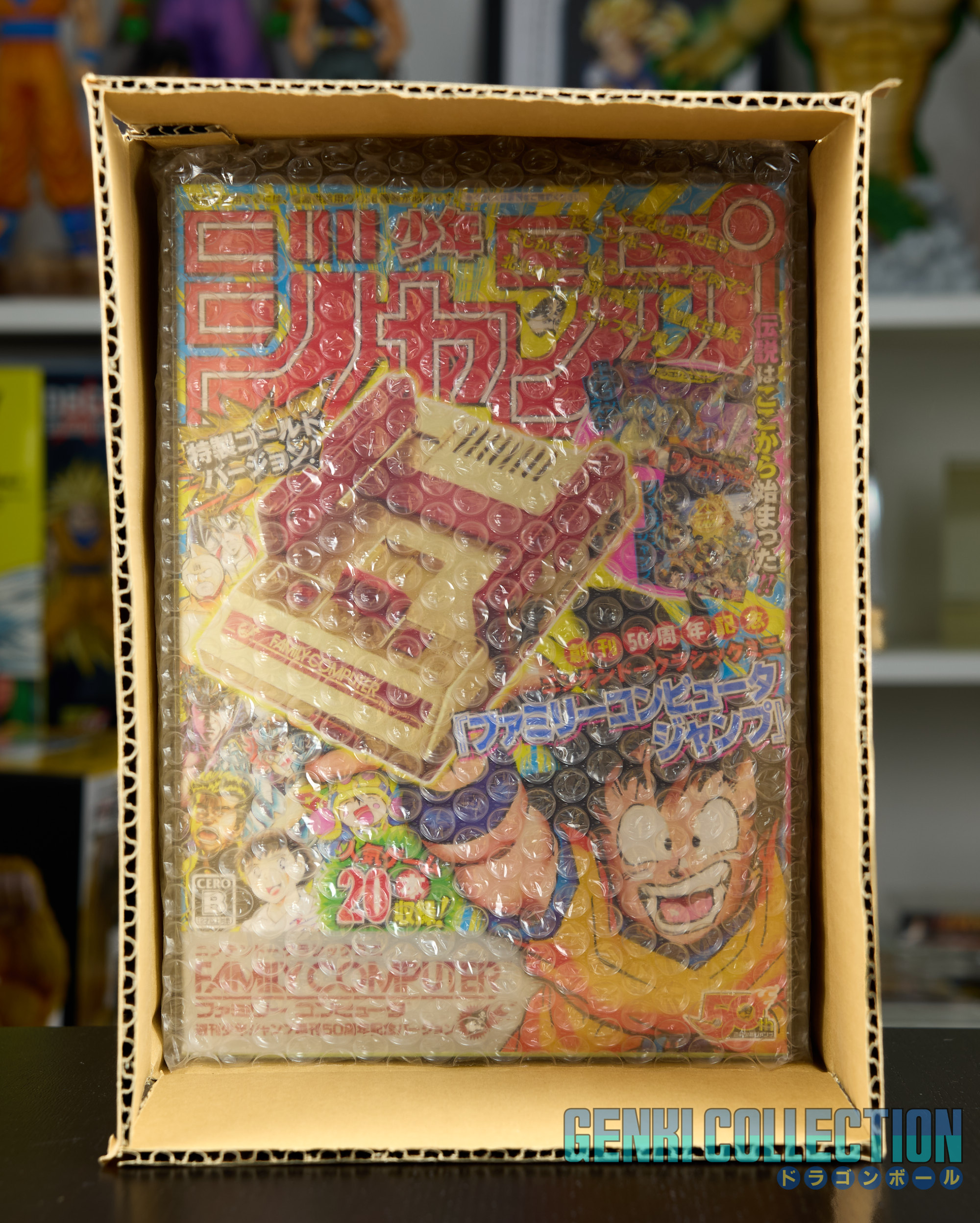 Famicom Jump Mini console presented in its Crystal Box, specially created to commemorate the 50th anniversary of Weekly Shonen Jump magazine in 2018. The console in its golden finish is complete and in mint condition, used only for making a YouTube video. The protective outer cardboard box is also included.