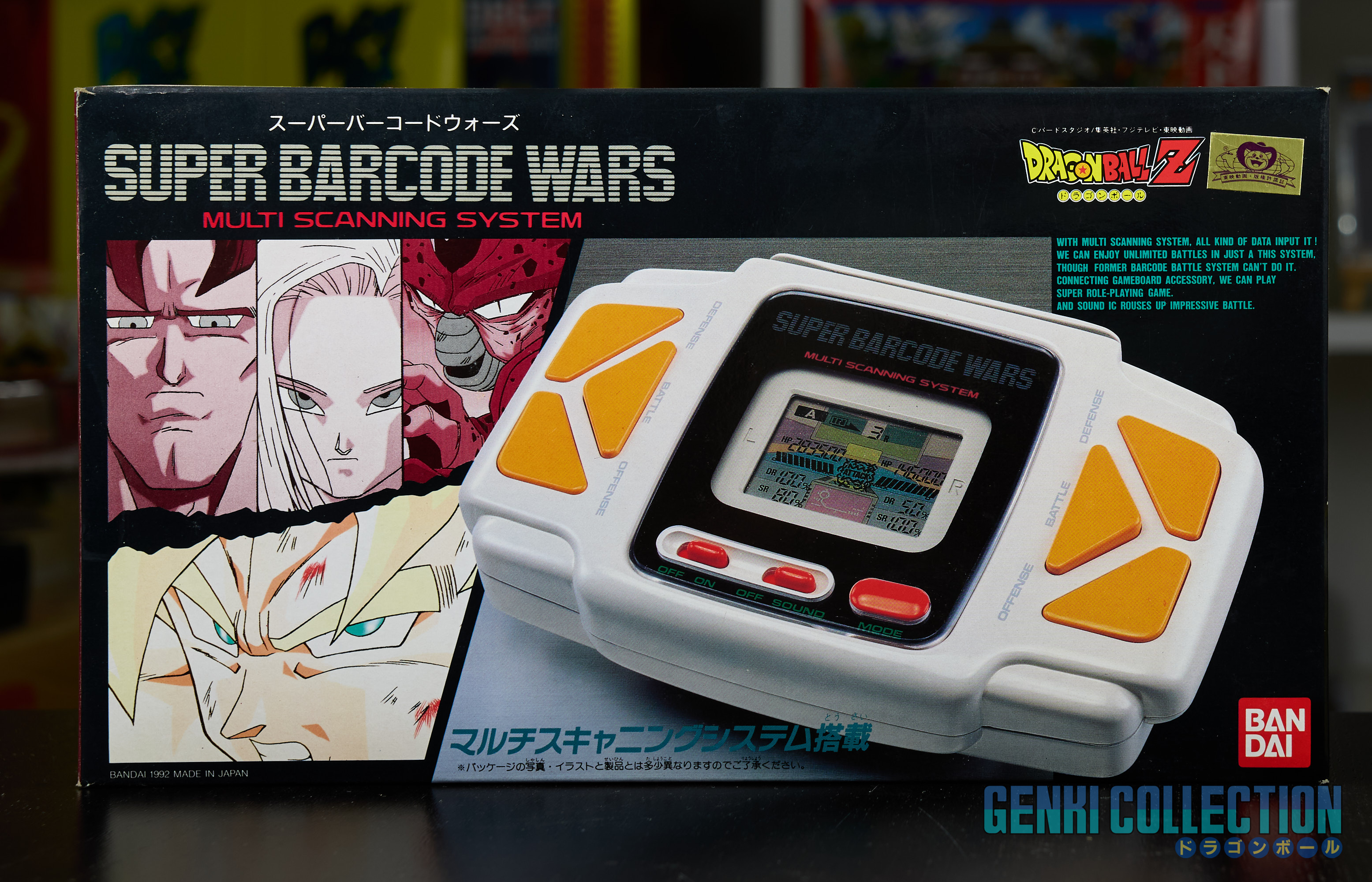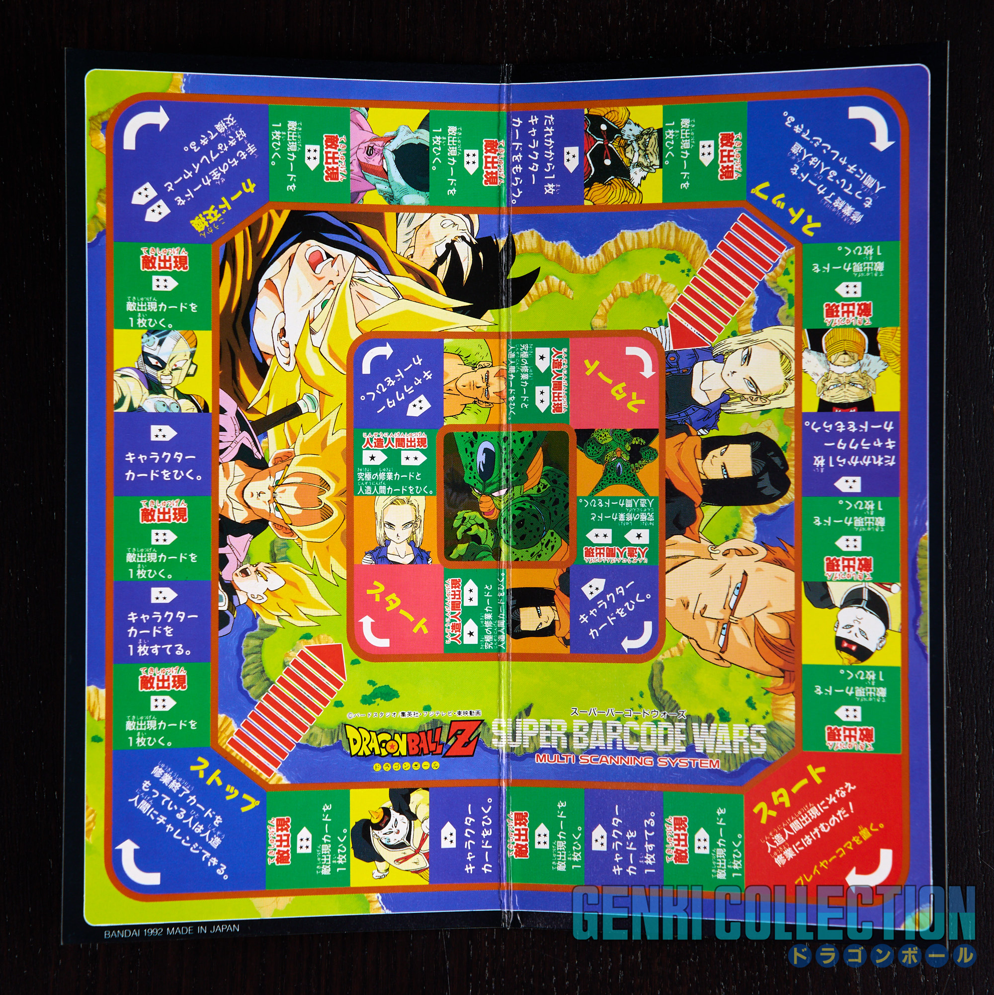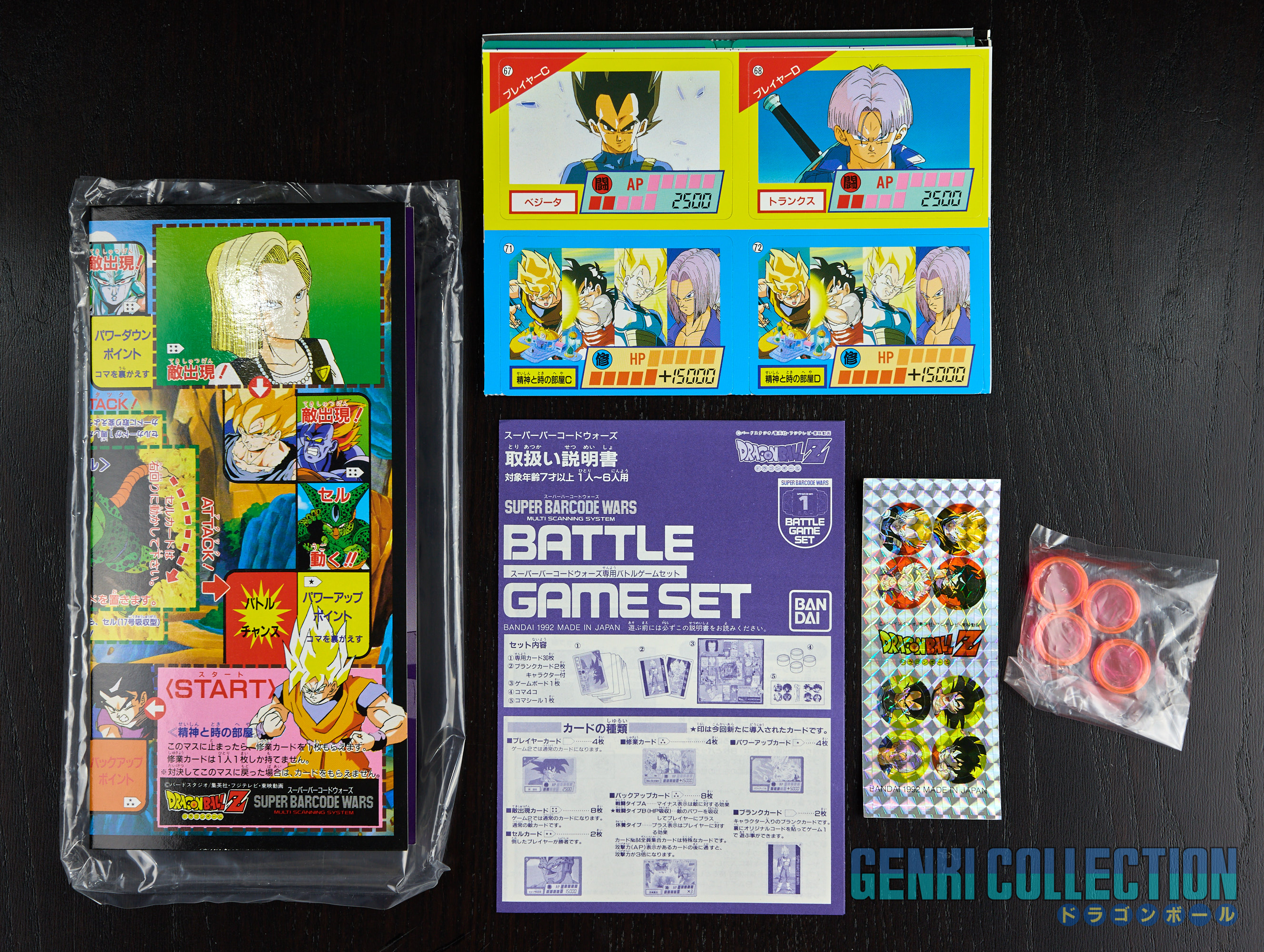 Dragon Ball Z Super Barcode Wars electronic game and its Battle Game Set appendix, released in 1992. The lot is in excellent, near-mint condition. The original game contains the barcode scanner device (battery operated), 4 tokens, instruction manual, a cardboard game board, and a set of 64 cards. The additional set includes 4 round tokens to be customized with "prism" stickers (unpeeled), an instruction manual, a new game board, and a set of 32 "sprued" cards (they have never been detached).