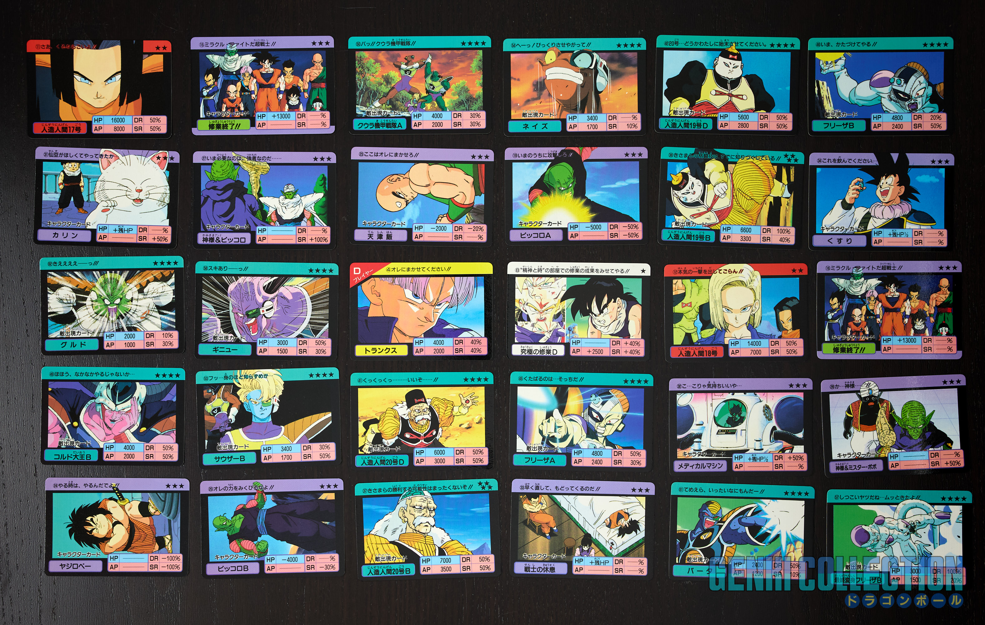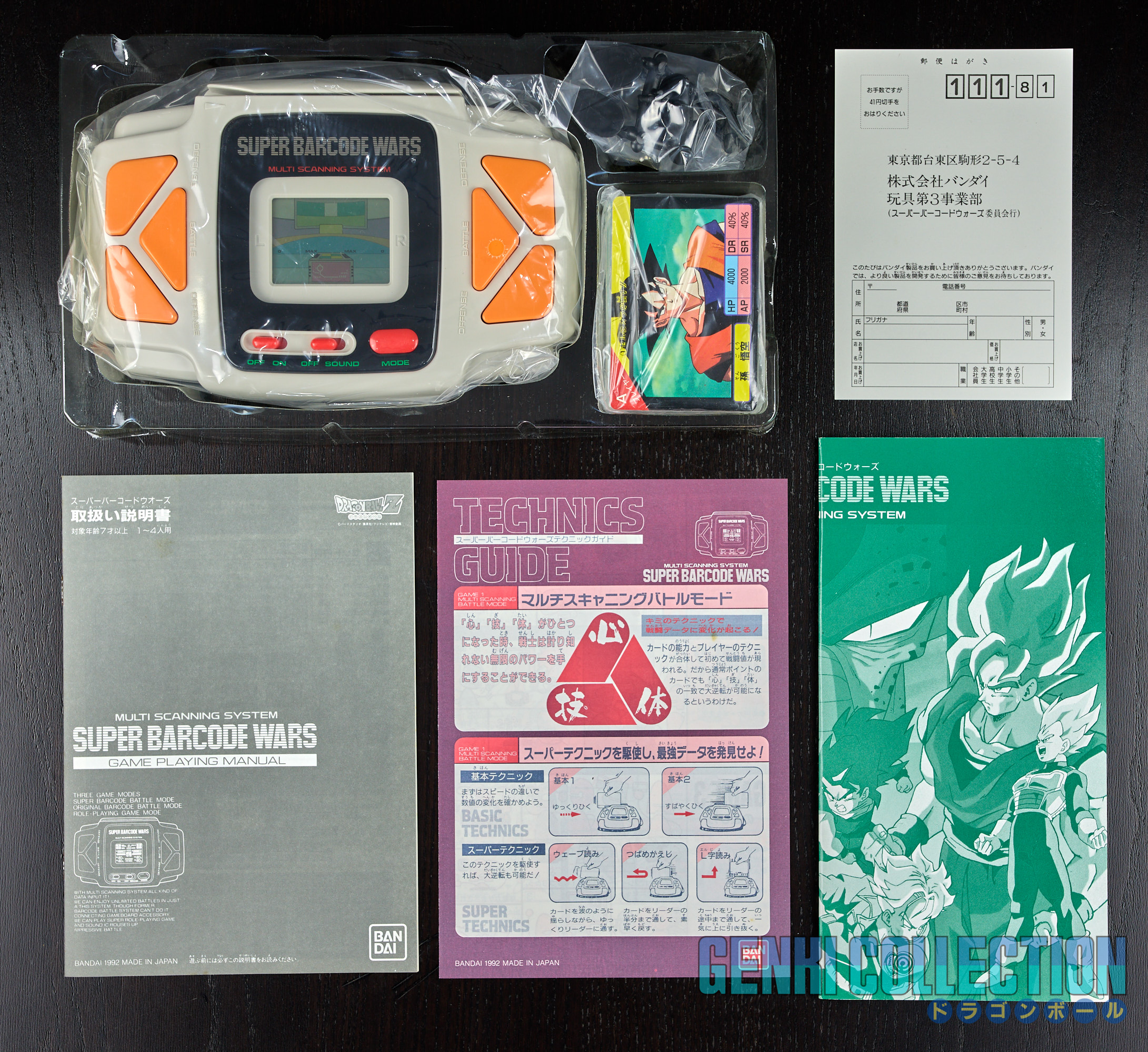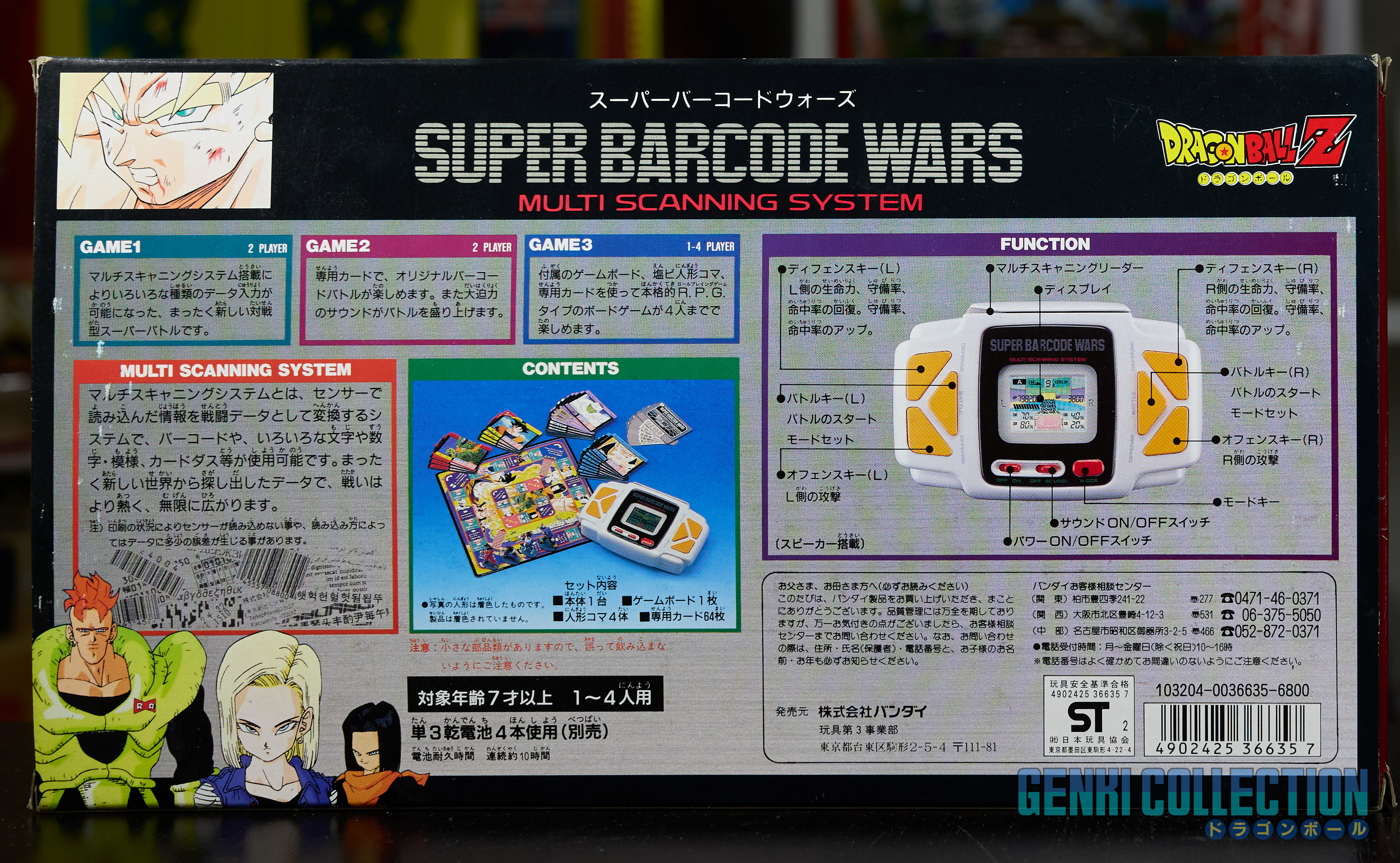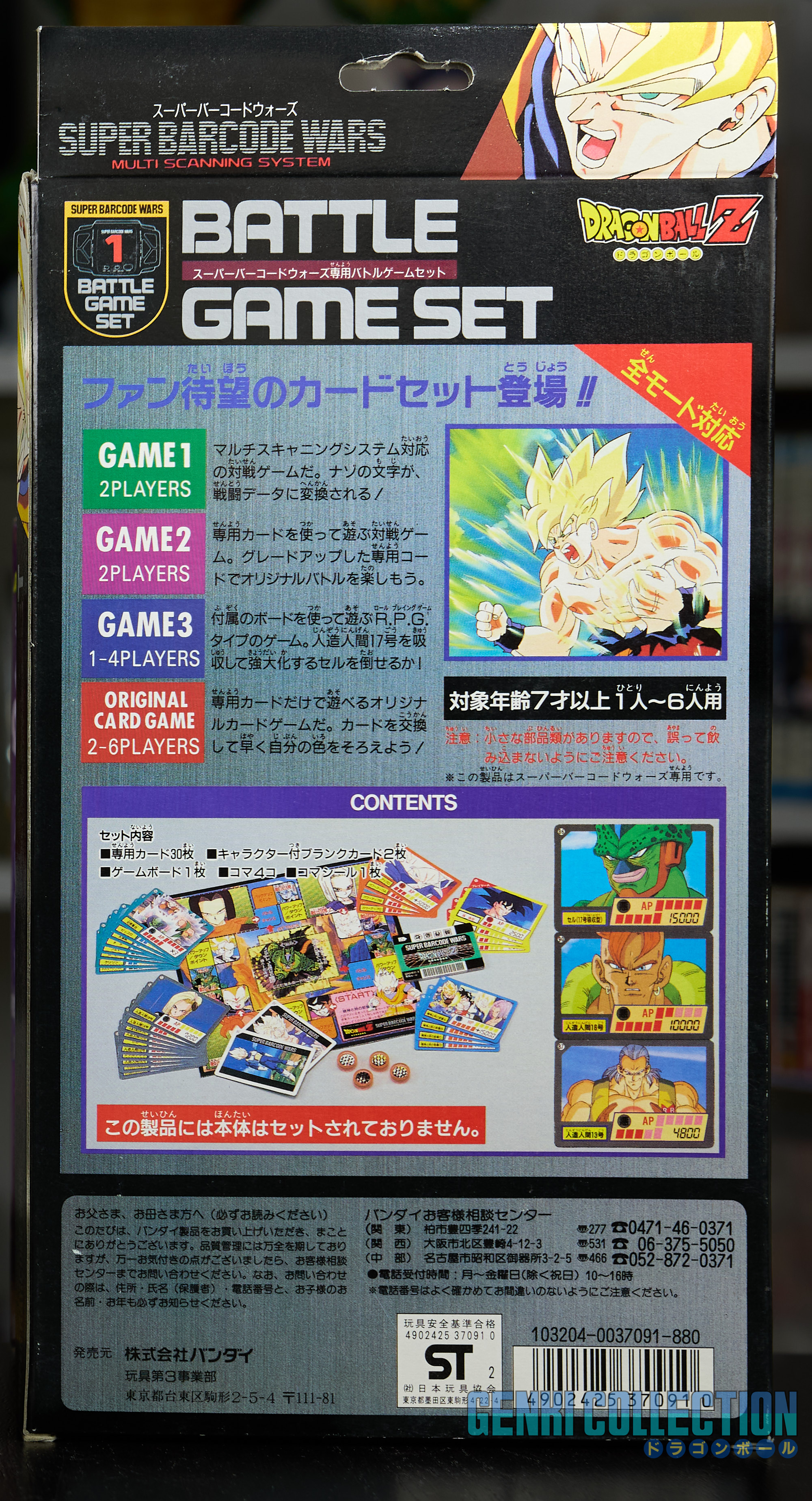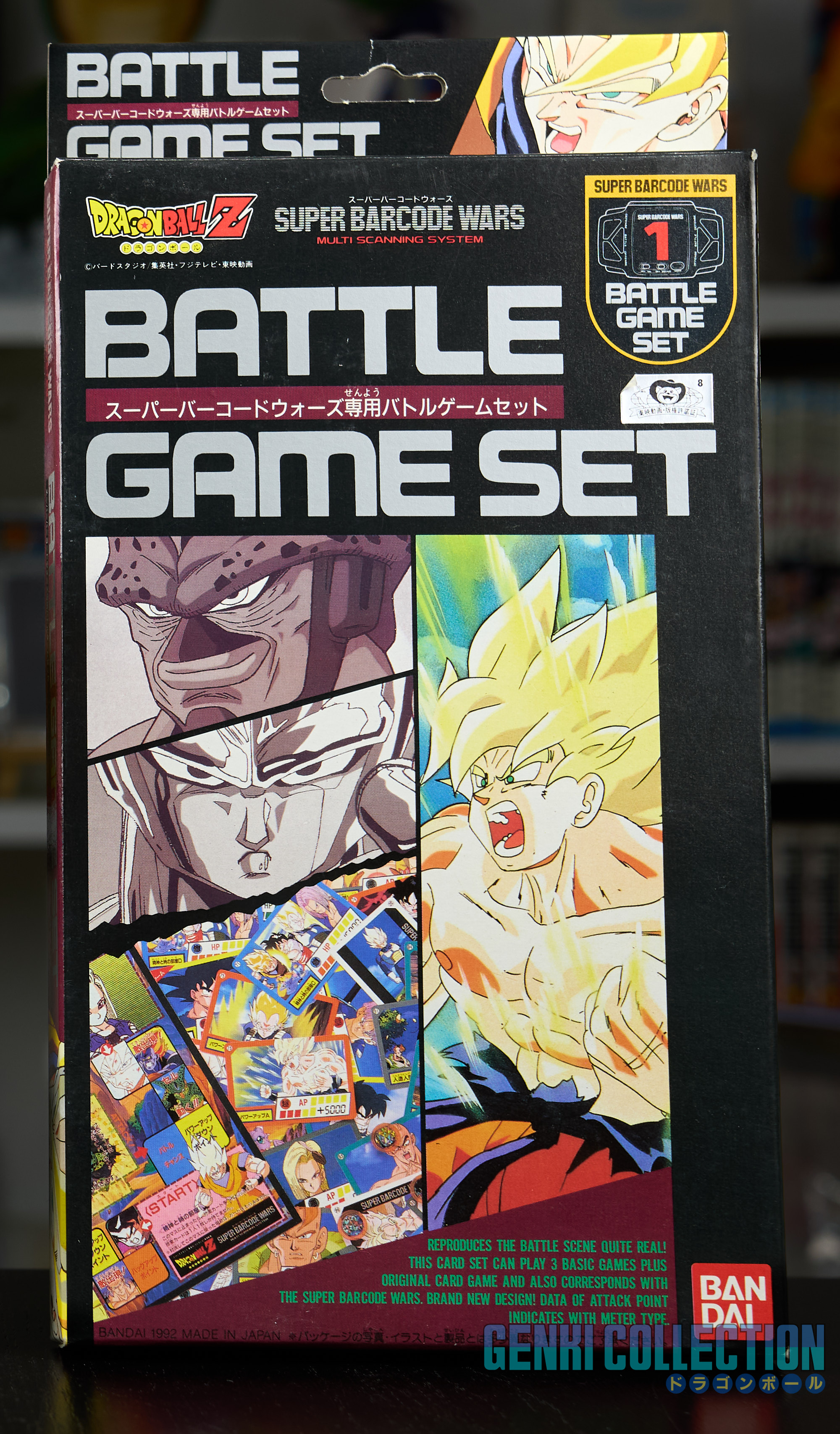 Jeu électronique Dragon Ball Z Super Barcode Wars et son appendice Battle Game Set, sortis en 1992. Le lot est en excellent état, proche du neuf. Le jeu original contient l'appareil de scan des codes barres (fonctionne avec piles), 4 pions, les instructions d'emploi, un plateau de jeu cartonné et un set de 64 cartes. Le set supplémentaire inclus 4 pions ronds à personnaliser avec des stickers "prisms" (non décollés), une notice d'instruction, un nouveau plateau de jeu et un set de 32 cartes "grappées" (elles n'ont jamais été retirées).